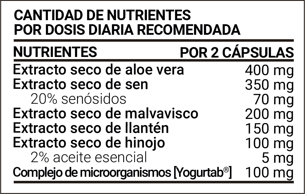 • Aloe Vera (Aloe vera L.): con propiedades laxantes suaves que estimulan la evacuación natural y contribuyen a eliminar toxinas del tracto intestinal.